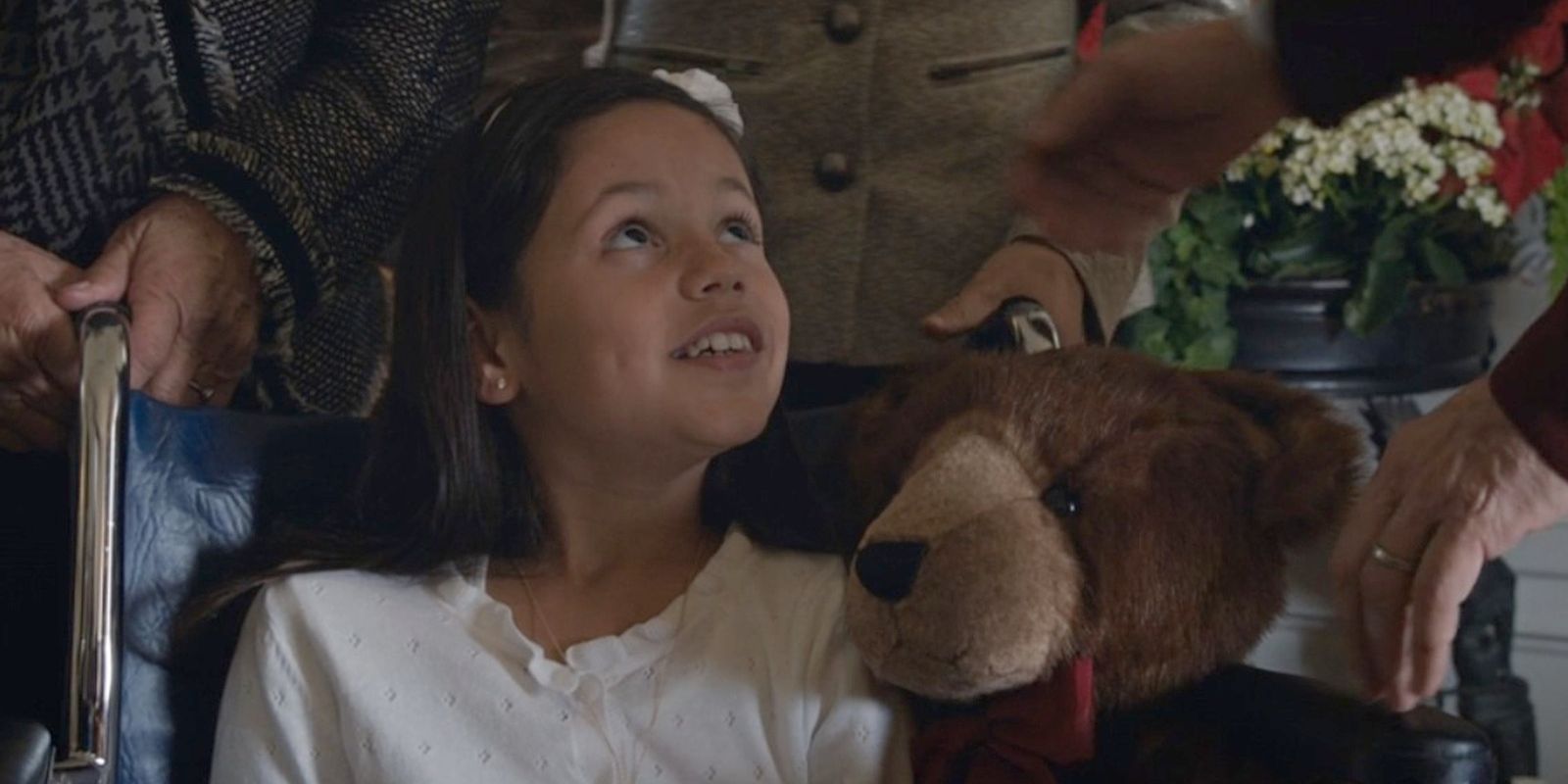 - The Shot: The VP hangs up and walks over to a young girl in a wheelchair. That’s Jenna. She’s holding a teddy bear and looks up at him with a huge, innocent smile.